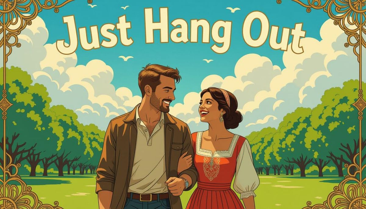 A vibrant graphic novel illustration of a Belgian man and Moroccan woman walking in a park. The scene blends art deco elements with soft lighting to evoke a joyful, romantic mood.