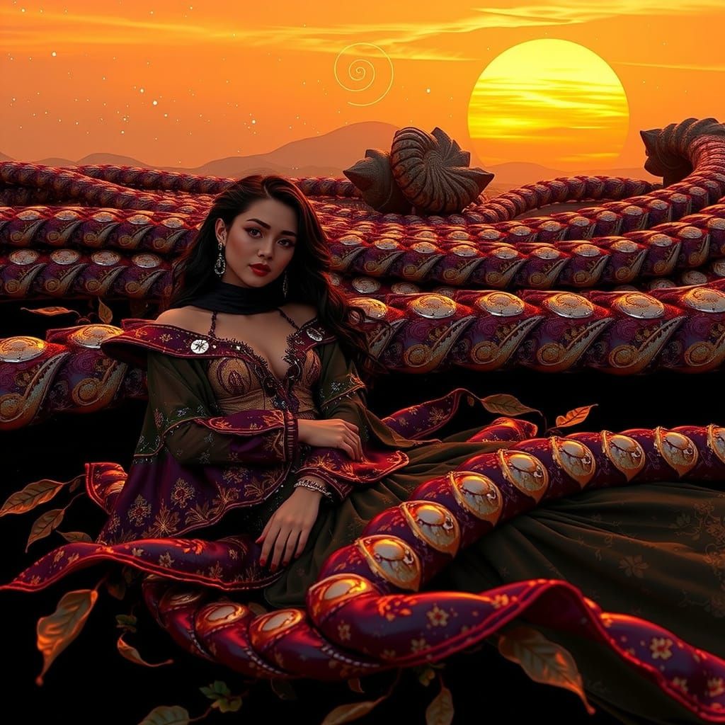 A striking picture of a woman with dark hair against a starry sky. She wears flowing attire with silver and green accents, rendered in a photorealistic 3D CGI style.