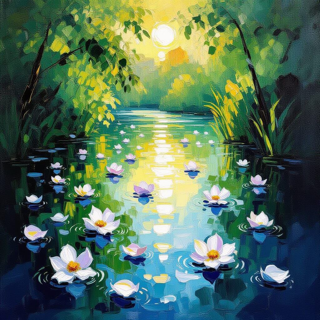 This image showcases scattered flower petals in water, with dark green tones in the background. It features a fantastical, artistic painting style with thick, colorful textured paint.