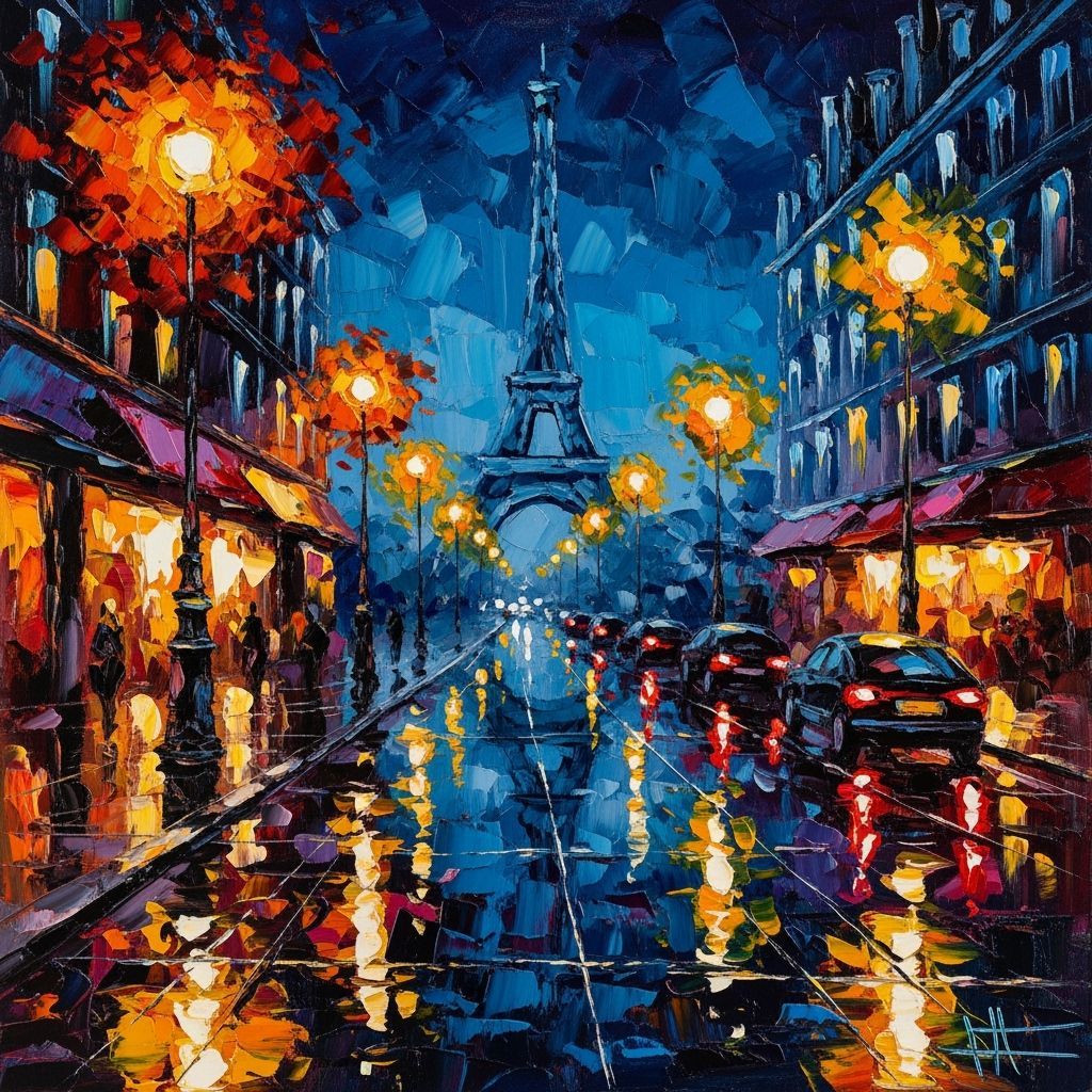 This image shows an abstract painting of Paris at night. It features bold, textured brushstrokes and a vibrant color palette, capturing moody lighting and wet street reflections in an expressive impasto style.