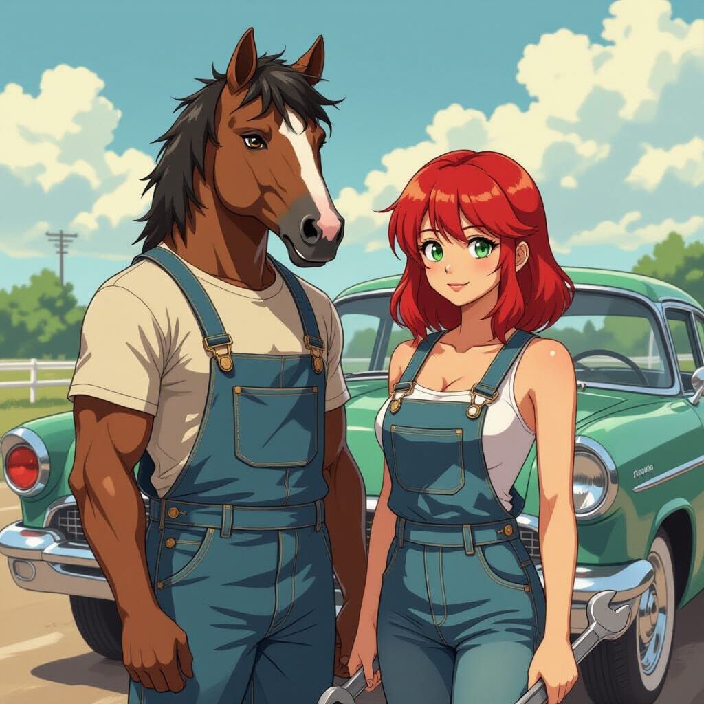 This image shows a centaur-like figure in overalls standing beside a young woman holding a wrench. The artwork is rendered in a vibrant anime style with cel-shaded textures and deep colors.