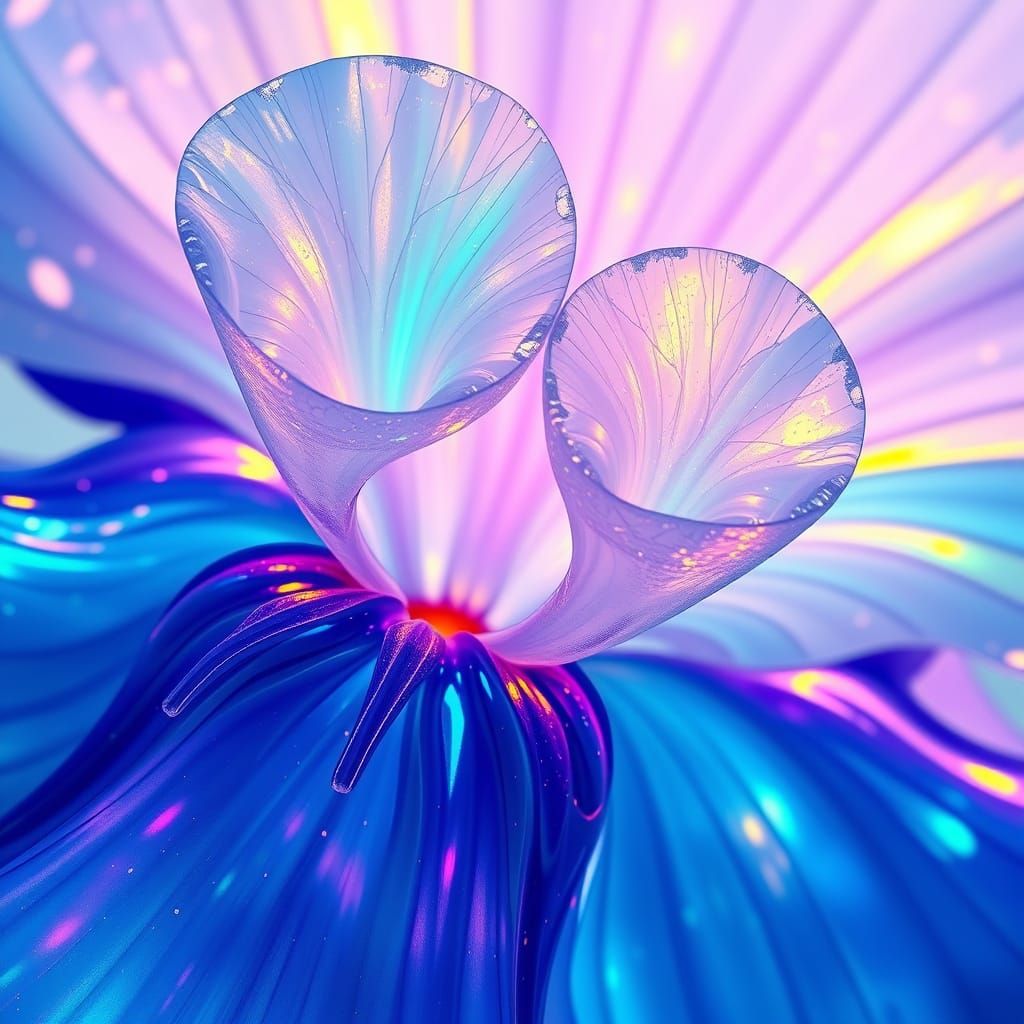 A digital rendering of a glass iris flower in blue, turquoise, and purple hues. The flower has an ethereal glow, with iridescent ornamentation and diamond painting effects.