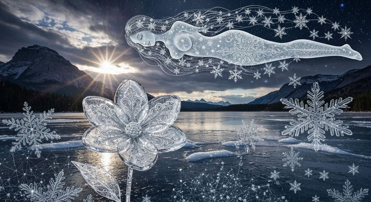 This image showcases delicate ice flowers with bioluminescent qualities blooming on a frozen lake. It features intricate filigree, cosmic energy, and a psychedelic, kaleidoscopic aura.