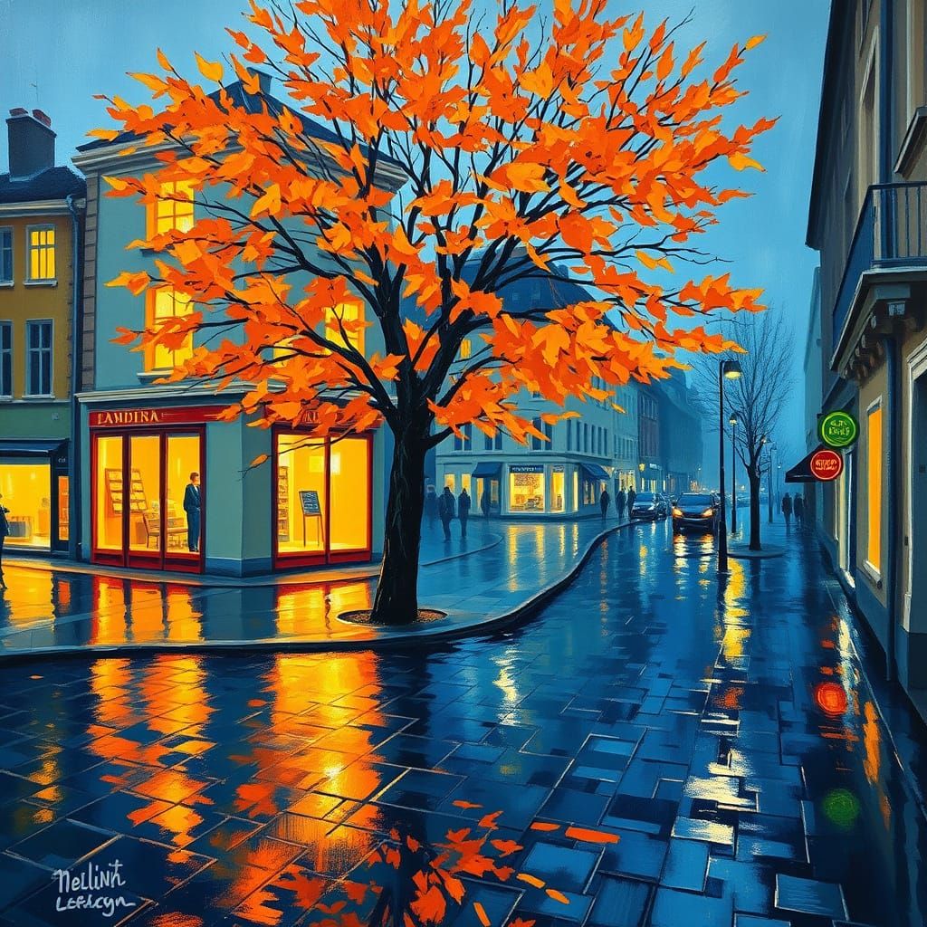 This impressionistic oil painting captures a European city street at dusk, showcasing warm light reflections on wet cobblestones and a lone autumn tree. Loose brushwork creates a cozy, reflective mood.