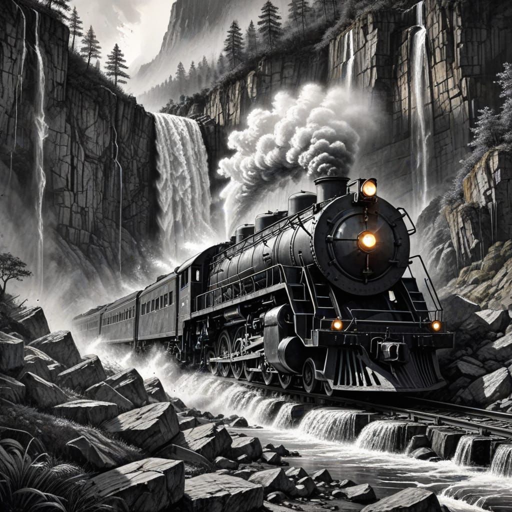 This image shows a close-up ink drawing of a train locomotive exiting mountains by a waterfall. It features bold, vibrating lines, cross-hatching, and splatters for a textured, schematic look.
