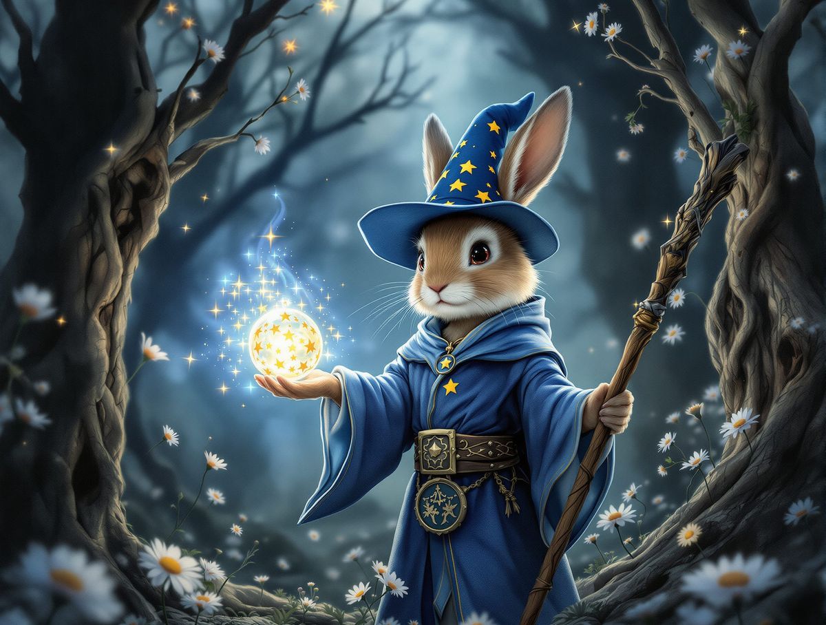 This image shows a rabbit wizard in a starry blue robe casting a spell to revive a withered tree with magical flowers, set in a misty forest under moonlight.