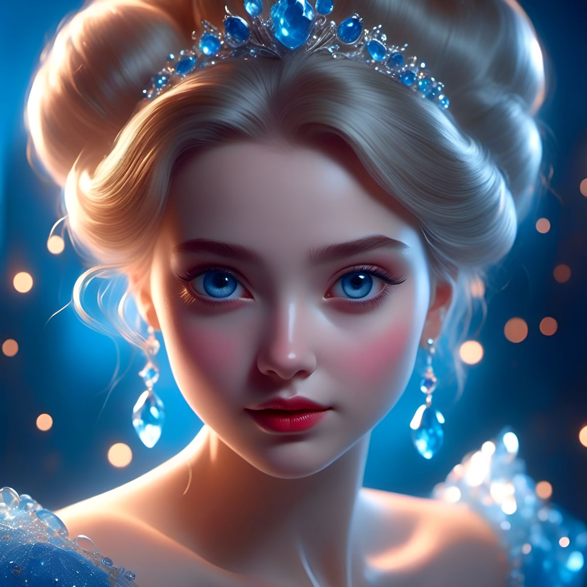 A 3D rendered image of a beautiful princess Cinderella with blue jewels in her hair. The character has red lipstick, a hyper-detailed face, and clear realistic eyes in a Pixar Disney style.