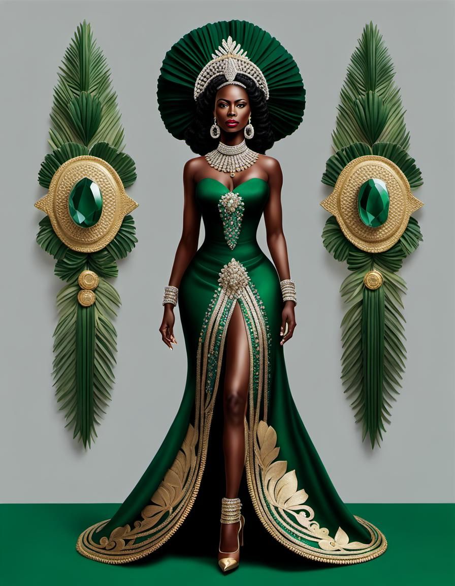 A hyperrealistic image of a beautiful young Colombian woman in a full-length pose. She wears a modern minimalist dress with military-style details and emerald rhinestones, complemented by gold high heels.