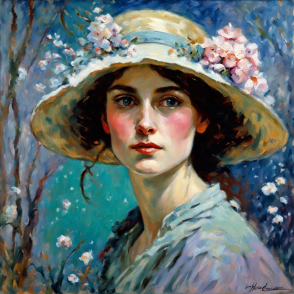 This portrait of a woman in a hat is a serene and intimate scene, set against a winter wonderland backdrop of snow-covered trees and a brilliant blue sky. Delicate snowflakes adorn her hair, while a soft pink lip color adds warmth to her features.