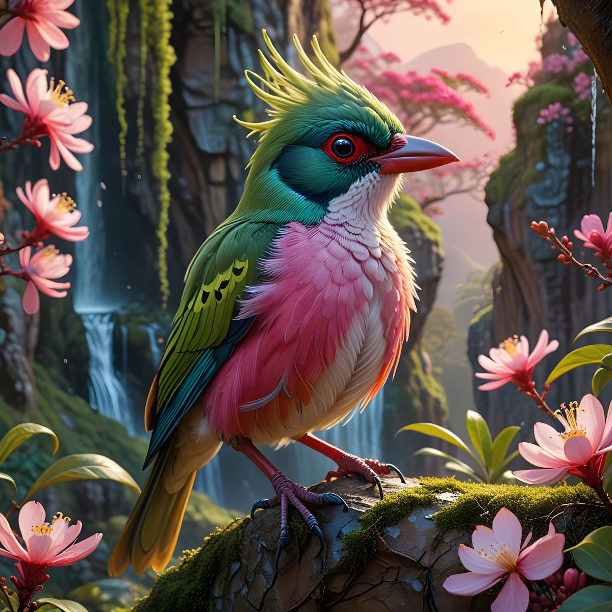 This image showcases a hyper-detailed, cute, fluffy Javan green magpie with a red beak and eyes, perched in a vibrant pink Tabebuia tree. The background features arched rock formations, jungle mountains, waterfalls, and a sunset, rendered with bleeding triadic paint textures.