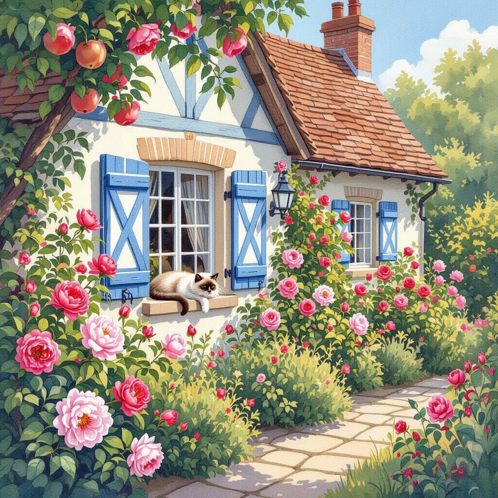 A charming watercolor illustration of a quaint village cottage, complete with blue shutters and a Siamese cat. The garden bursts with colorful flowers under a bright sky in this cottagecore art.