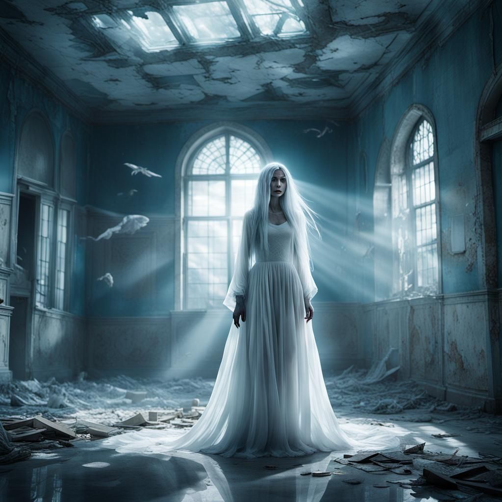 This image shows a mystical woman in a flowing white dress, floating above the ground in a dimly lit abandoned hospital. Created in a detailed matte painting style with intricate texture and deep color, the piece features a cool color palette with indigo and purple hues, complemented by warm candlelight....