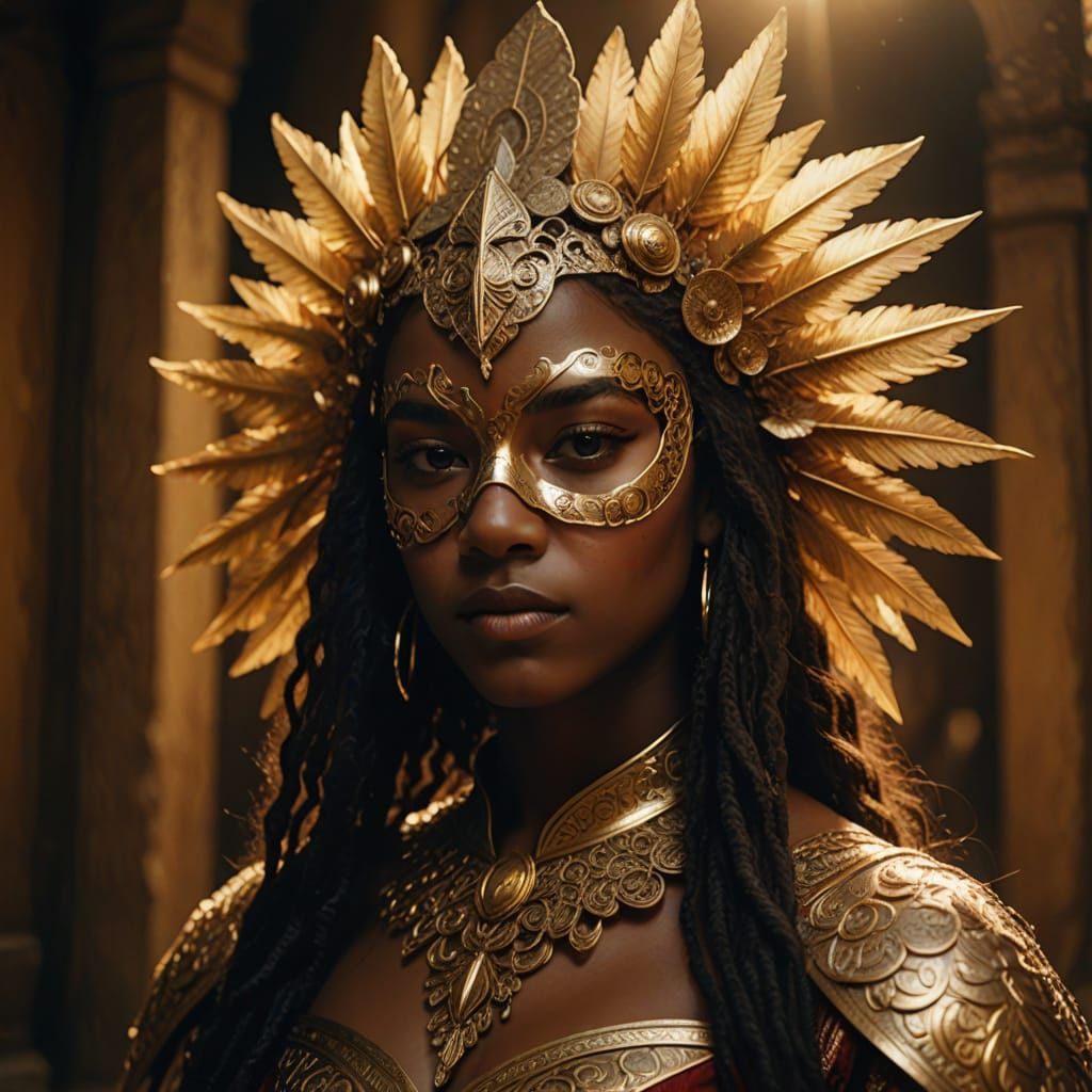 This image shows a young Caribbean-English woman in a saint-inspired costume and mask. The portrait is rendered in a vibrant, hyperrealistic style with rich textures, warm colors, and cinematic lighting.