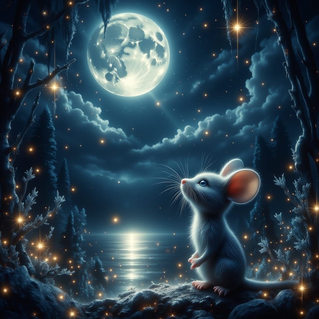 This image depicts a small mouse looking up at a large full moon on a starry, glittery midnight sky, with lace accents adding an ethereal touch.