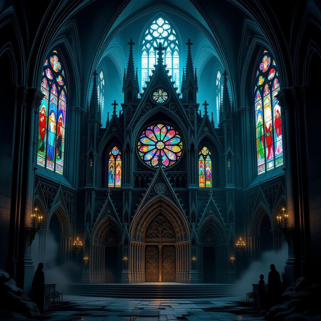 A dramatic Gothic cathedral with intricate carvings and stained glass, rendered in a dark, surreal, and mystical style evocative of biomechanical and dystopian art.