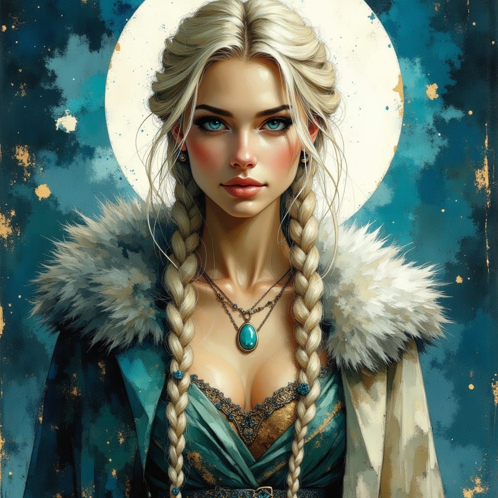 A striking picture of a beautiful Norse goddess with braided platinum blonde hair and intense blue eyes. The portrait features soft fur textures, delicate skin, and an elegant, romantic atmosphere.
