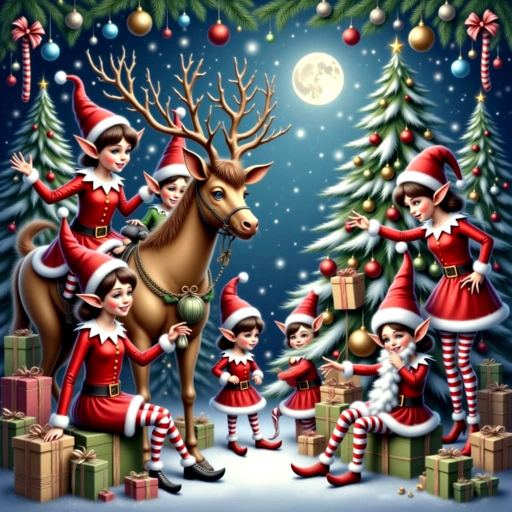 This image captures a whimsical Christmas scene where mischievous elves hilariously disrupt a family celebration, creating chaotic fun.