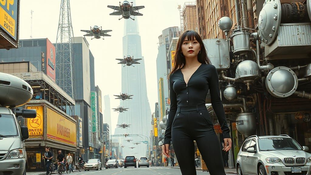 This image shows a kawaii woman in a black jumpsuit amidst steampunk machinery on a futuristic city street. Flying vehicles soar above in this hyper-realistic scene with a mysterious atmosphere. The art style blends futuristic landscapes and vibrant digital art.