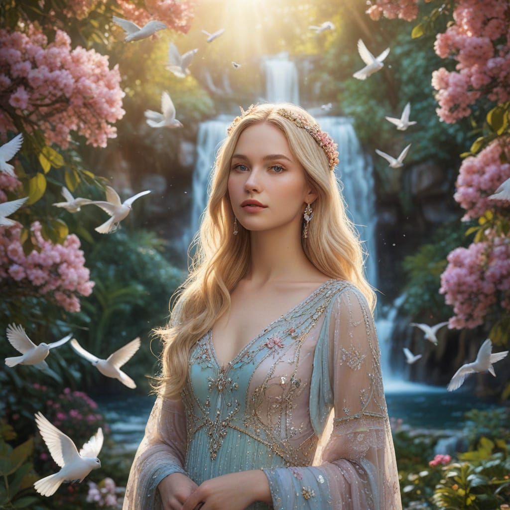 A breathtakingly beautiful digital art image of a stunning Pleiadian princess in a lush Garden of Eden, surrounded by vibrant flowers, waterfalls, and a crystal pyramid, bathed in soft pastel colors and divine light.