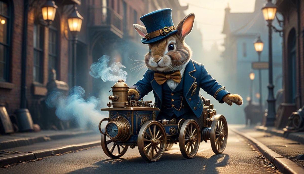 This image shows a charming steampunk-inspired scene of a bunny in a top hat and vest hopping down a steam-powered road, collecting eggs, amidst intricate brass details and warm golden light