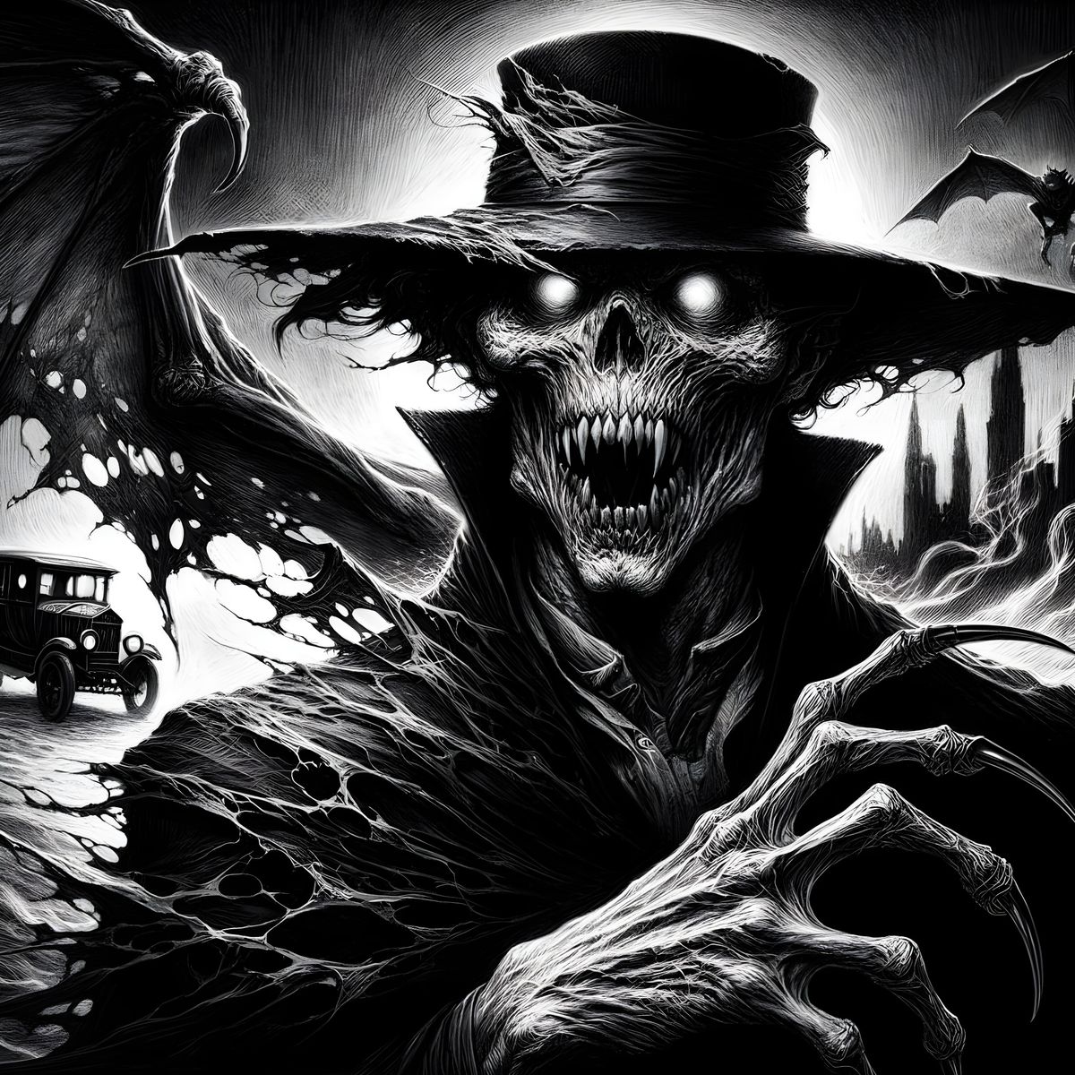 This image shows a menacing vampire figure with monstrous features standing over a gothic landscape. The black and white pencil sketch uses stark contrasts, intricate cross-hatching, and swirling smoke to create a macabre and eerie scene in an art nouveau style.