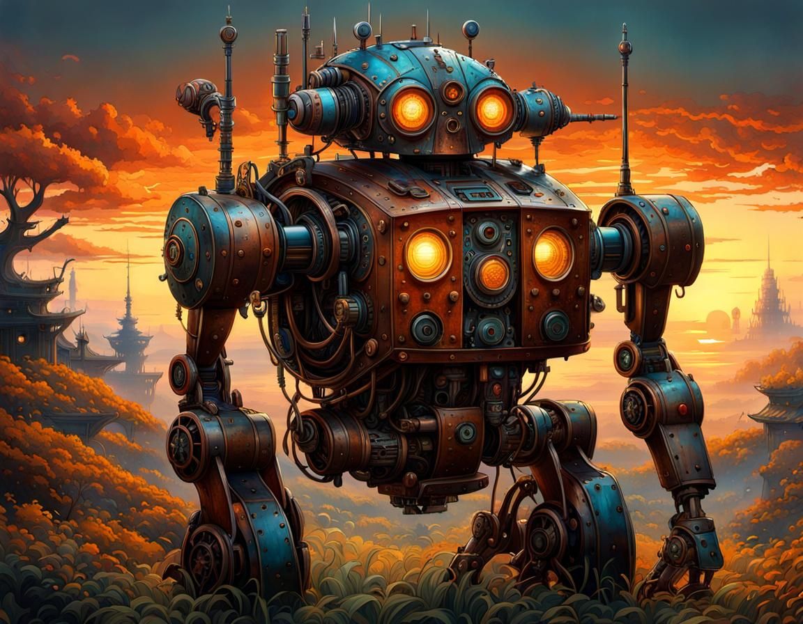 A highly detailed digital painting of an old, rusted robot. The image features rich colors and ethereal fantasy elements, reminiscent of art nouveau with a romantic aesthetic.