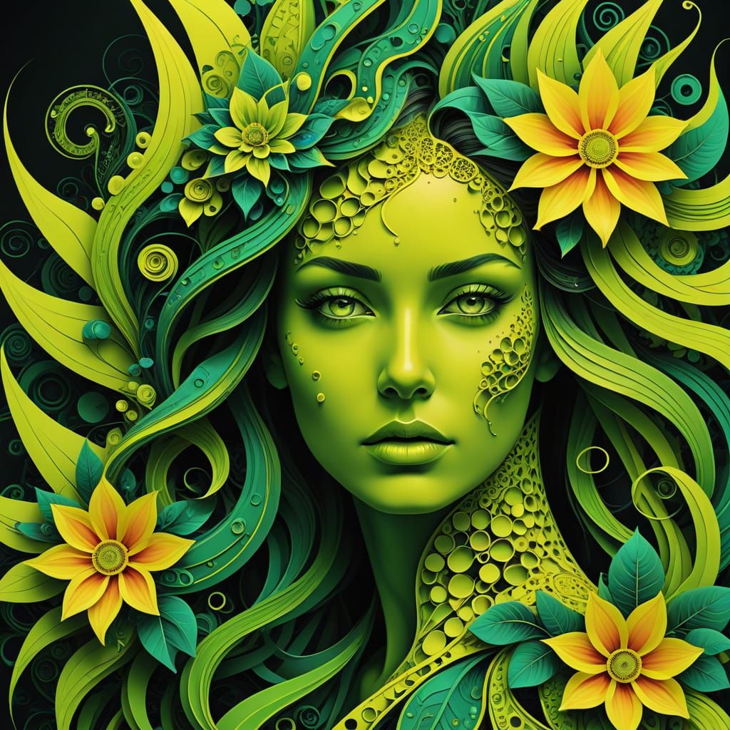 A surreal, cubist portrait of a beautiful woman-flower hybrid. The figure features geometric shapes, flower-like hair and eyes, pearl skin, and red lips, with neon yellow and green accents.