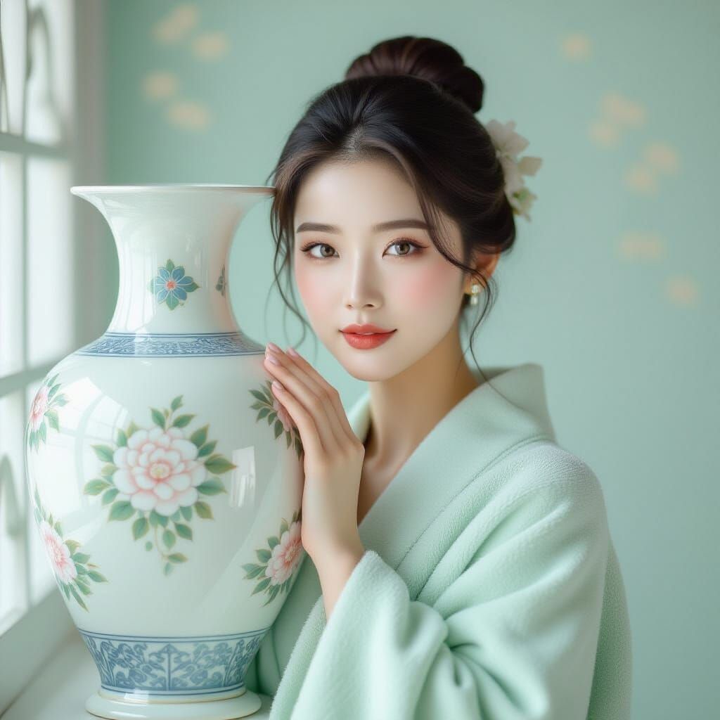 A serene image of a beautiful Korean woman with porcelain skin, wrapped in a light green towel, peeking from behind a white vase. The style evokes delicate, ornate patterns with soft lighting.