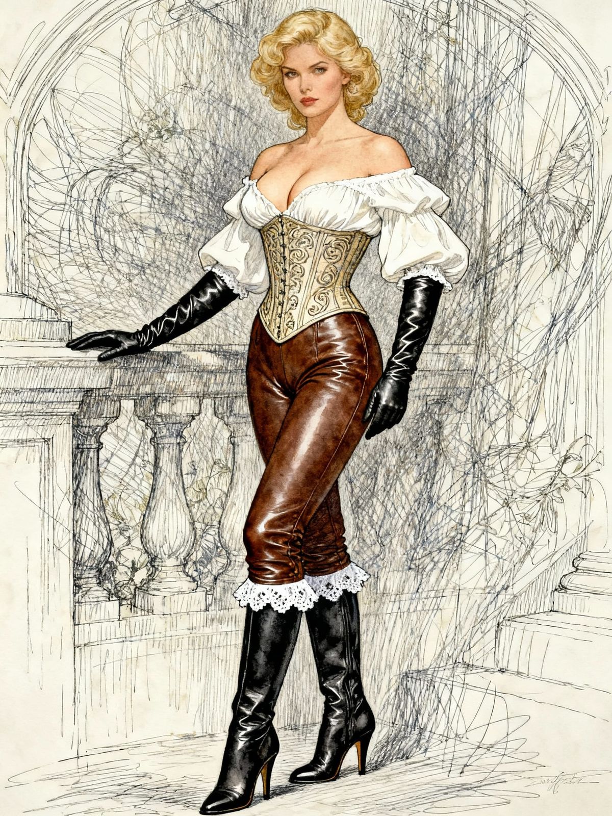 This watercolor portrait features a blonde pinup in historical attire, including a corset and tall boots, rendered with delicate fine line scribble art.