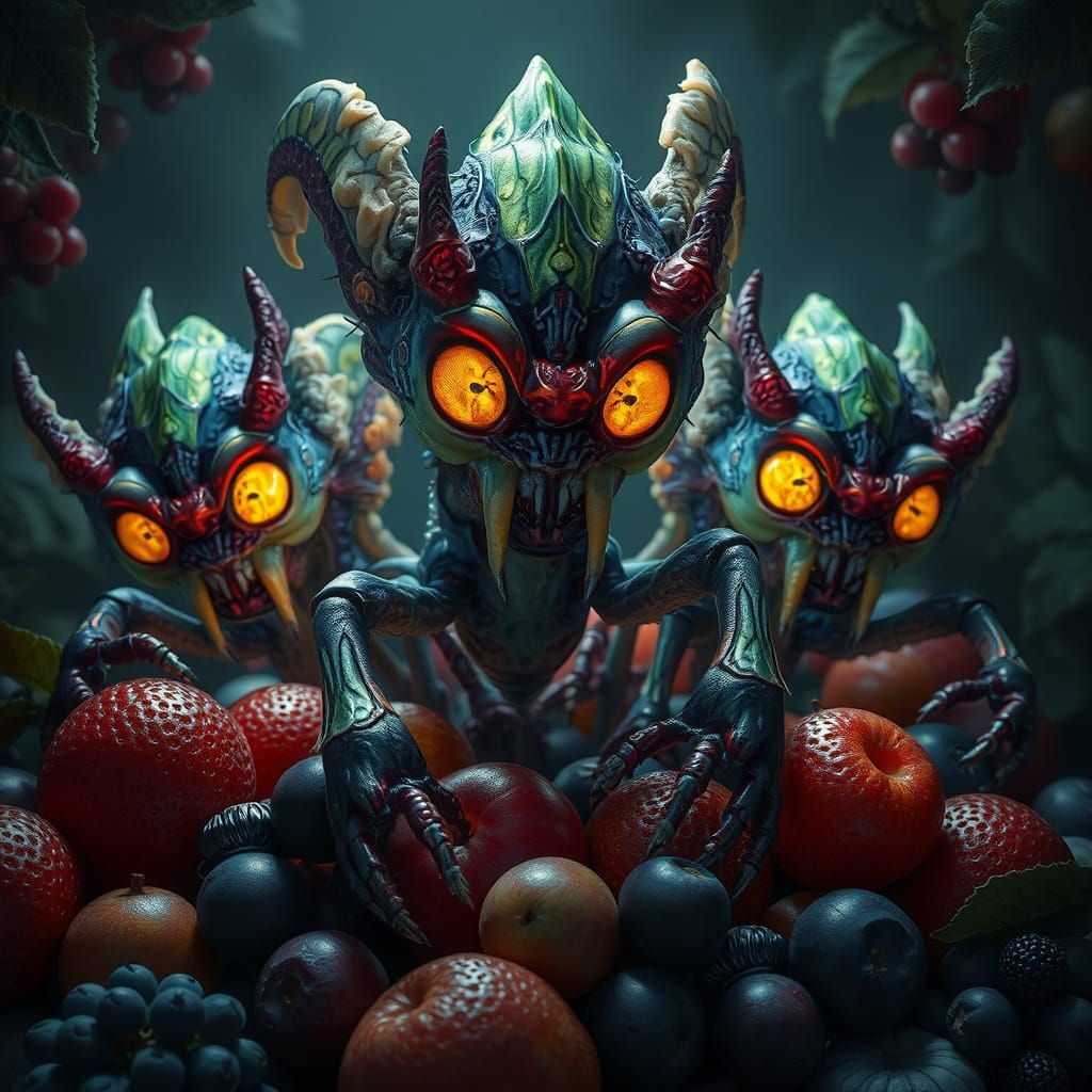 A hyperrealistic photograph shows ghostly arachnid monsters with slender legs and glacial eyes amidst vibrant exotic fruits in a dark, humid environment. The artwork is in a Greenlims aesthetic.