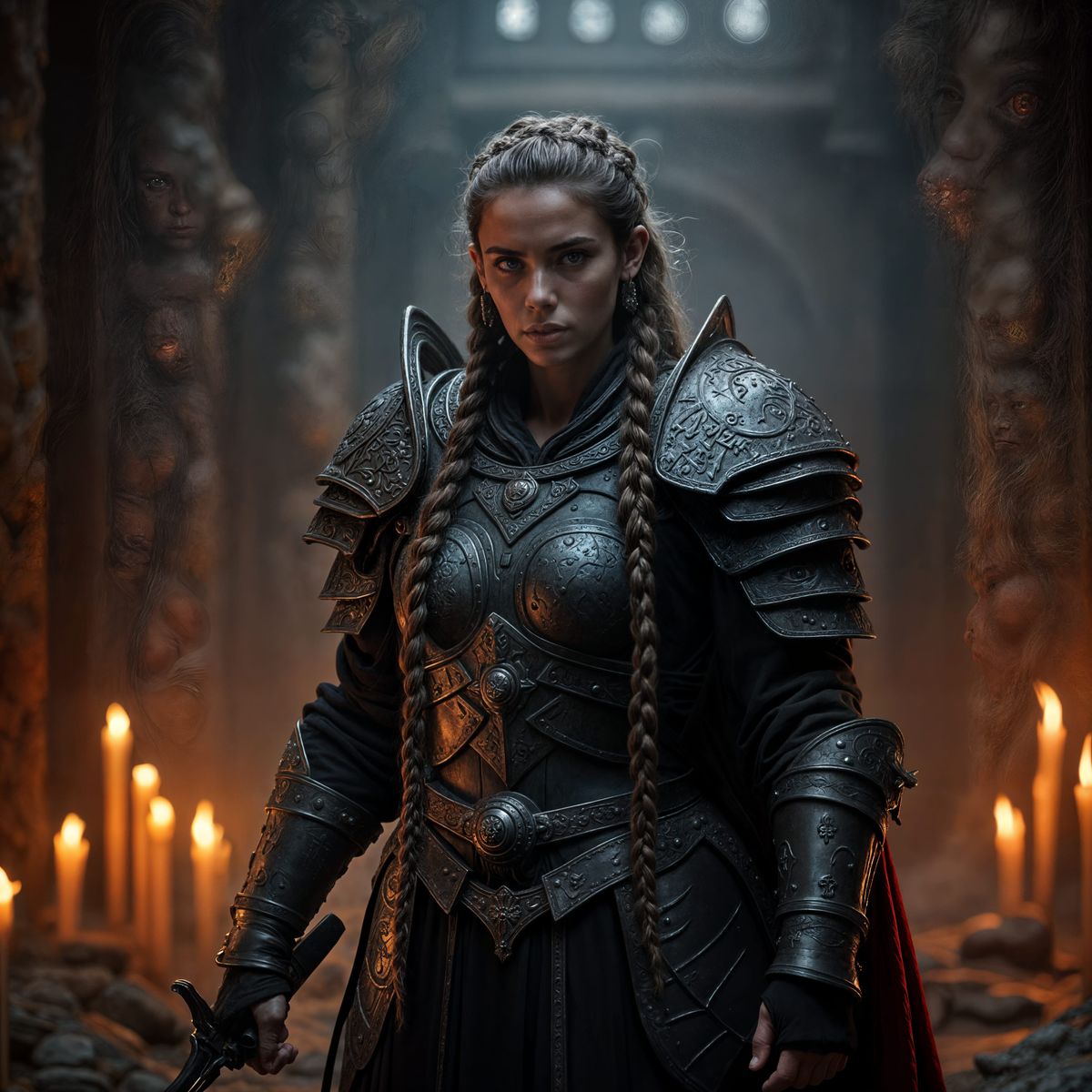 This image shows a powerful female figure standing strong in her throne room, adorned with intricate braids and glowing runes. The dark, moody atmosphere and cinematic lighting create a striking scene.