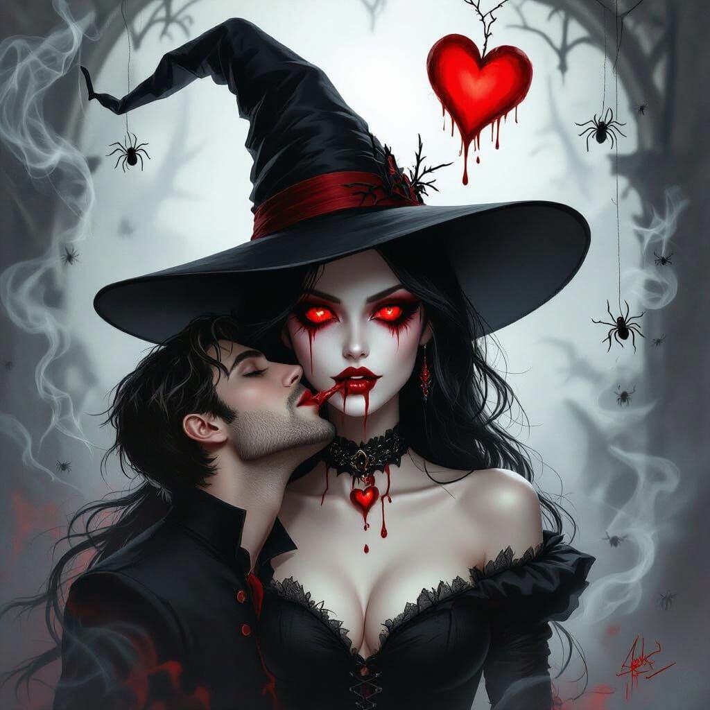 A striking image of a witch with heart-shaped eyes, biting her prince's neck. This dark, gothic fantasy art features dramatic lighting, smoke, and spiders.