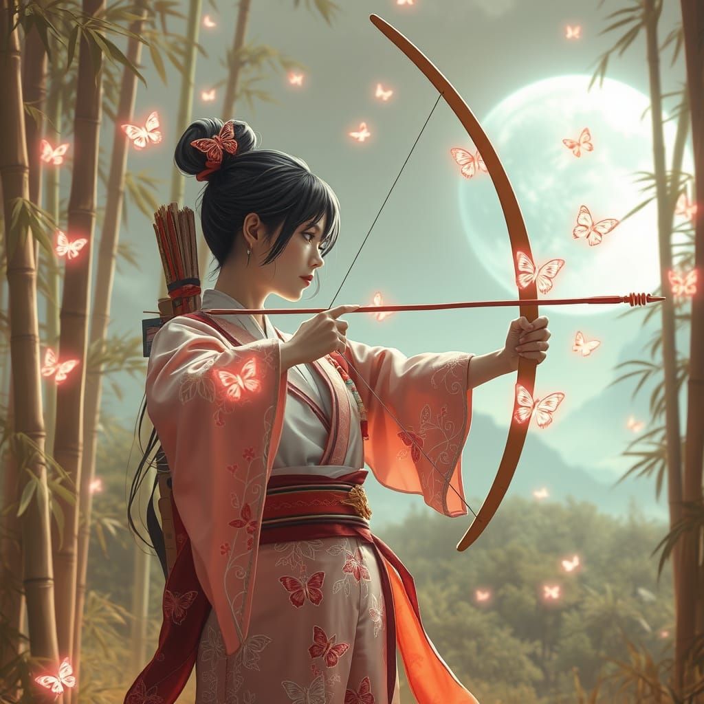 This image shows a futuristic archer in a bamboo forest on an alien world. The scene blends Japanese motifs with a retro-futuristic aesthetic, featuring soft lighting and warm tones as digital art.