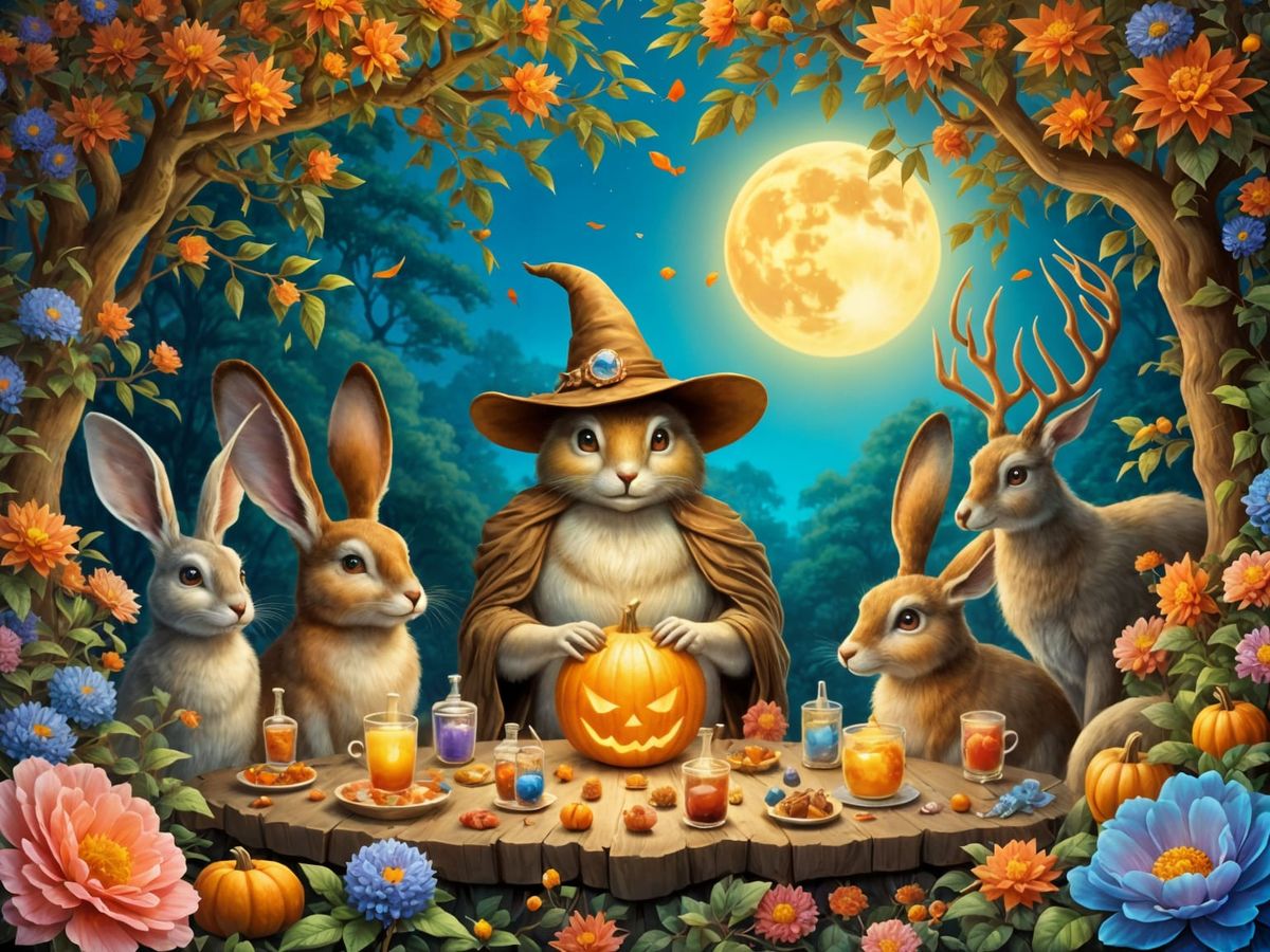 An ethereal scene of anthropomorphic woodland animals enjoying a secret Halloween feast in the moonlight. Features a wise owl, glowing potions, and enchanted treats, rendered in a storybook illustration style.