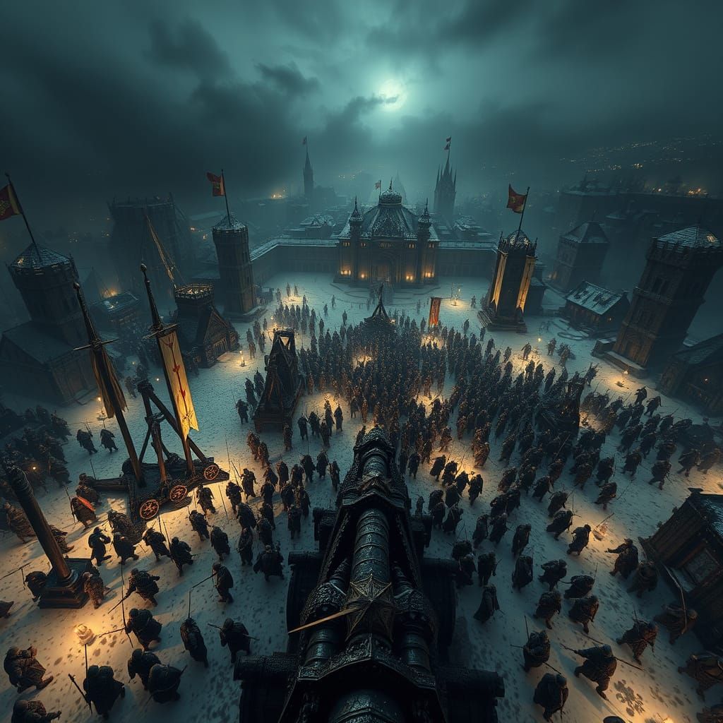 This image shows a vast army besieging a medieval city on a dark winter night. Siege weaponry and monstrous creatures are arrayed against the city walls.