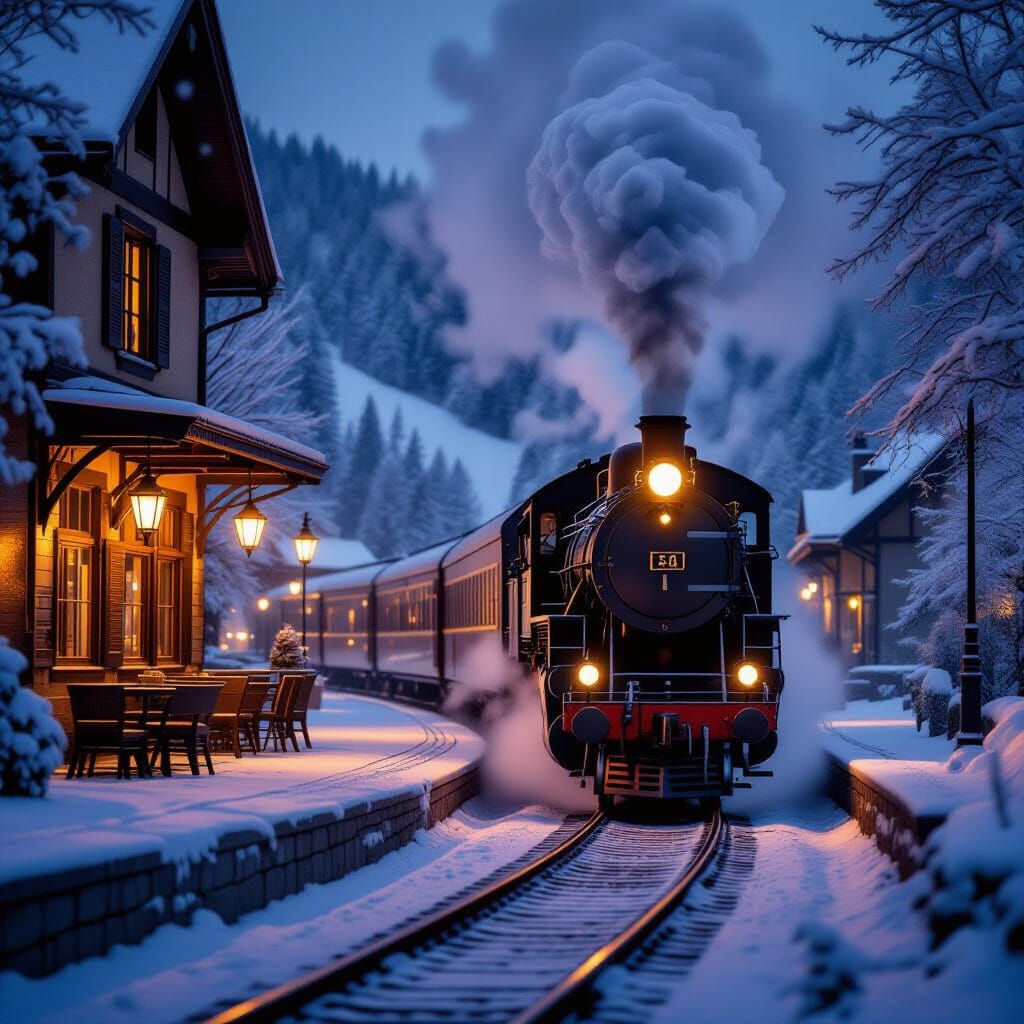 A hyper-realistic photograph captures a vintage steam train arriving at a cozy, snow-covered European village station at dusk. Warm lights from a cafe and lanterns create a nostalgic, cinematic atmosphere.