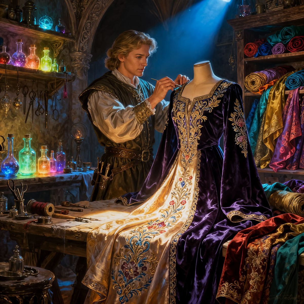 This image showcases a magical tailor creating elegant medieval tunics and robes with vivid, high-contrast colors and extreme detail for sophisticated clients.