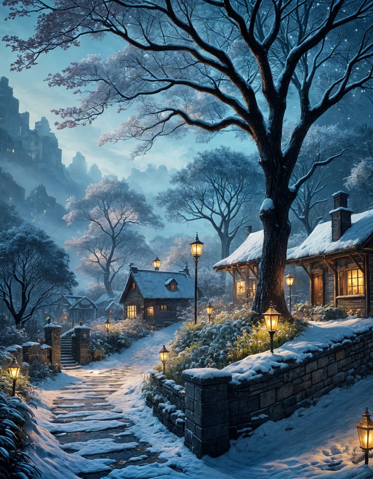 This illustrative image depicts an elegant winter scene, beautifully lit and rendered with atmospheric, painterly detail. The glowing, elaborate composition evokes a sense of wonder.