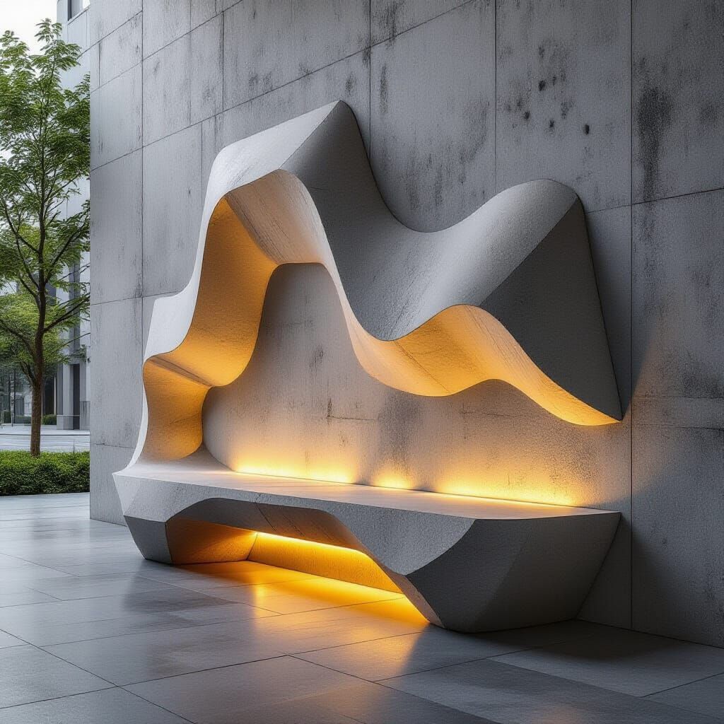 This image shows a modern sculptural bench emerging organically from a concrete wall, highlighting raw textures and architectural harmony. Dramatic lighting emphasizes its brutalist style.