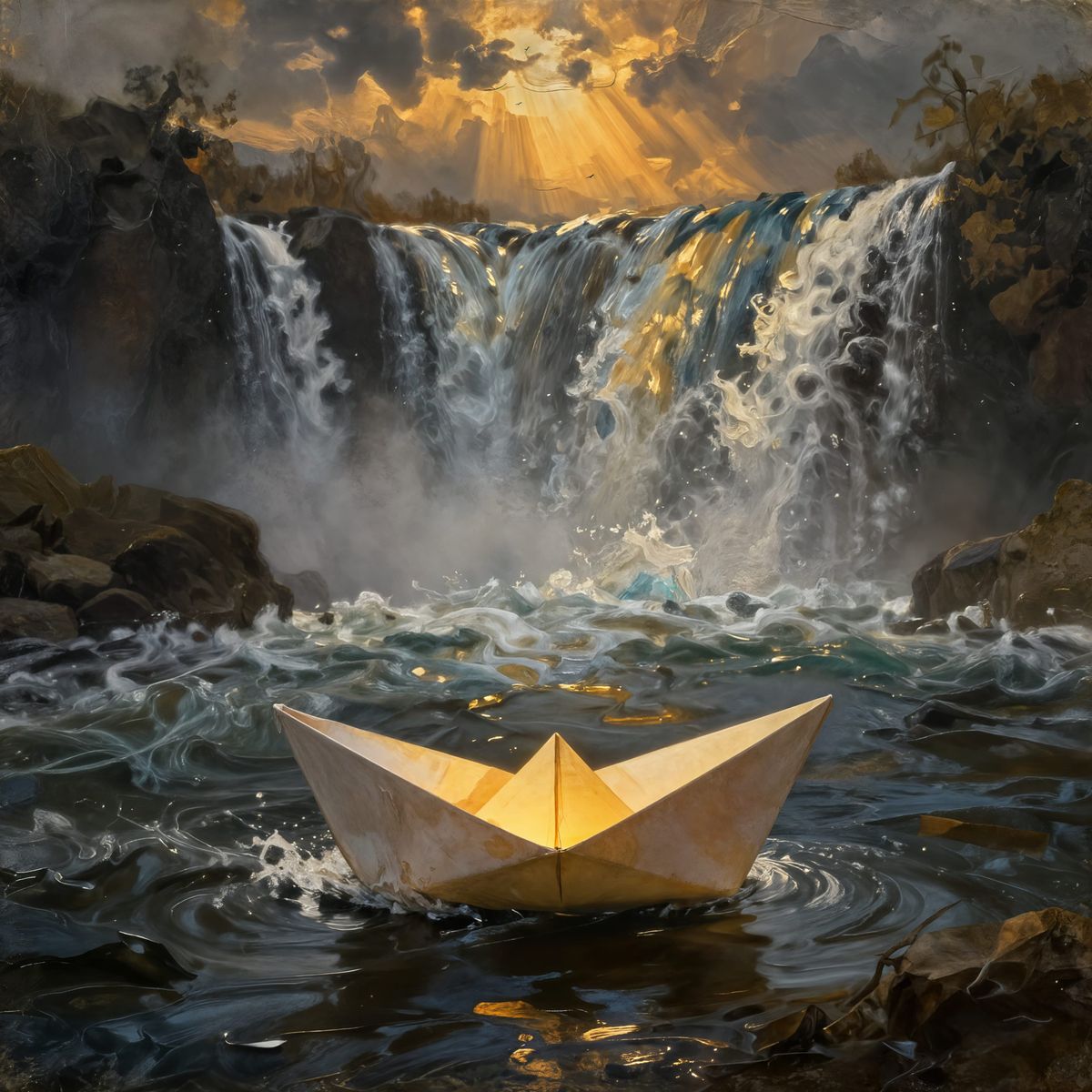 This image shows a glowing paper boat navigating turbulent rapids after a waterfall. Rendered in a Rembrandt-style oil painting with dramatic lighting and visible brushstrokes.