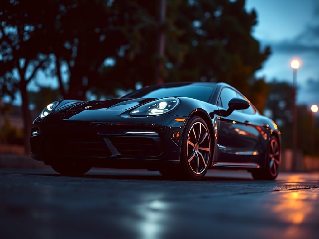 This image captures a Porsche Panamera during the tranquil blue hour. Shot with a shallow depth of field, it highlights the car's intricate details against a dreamy backdrop, embodying a popular influencer aesthetic.