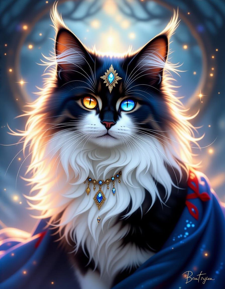 This image features a magical witch cat with fur in blue, silver, gold, red, and white. Its eyes sparkle with enchanted magic, rendered in a luminous fantasy art style with shimmering effects.