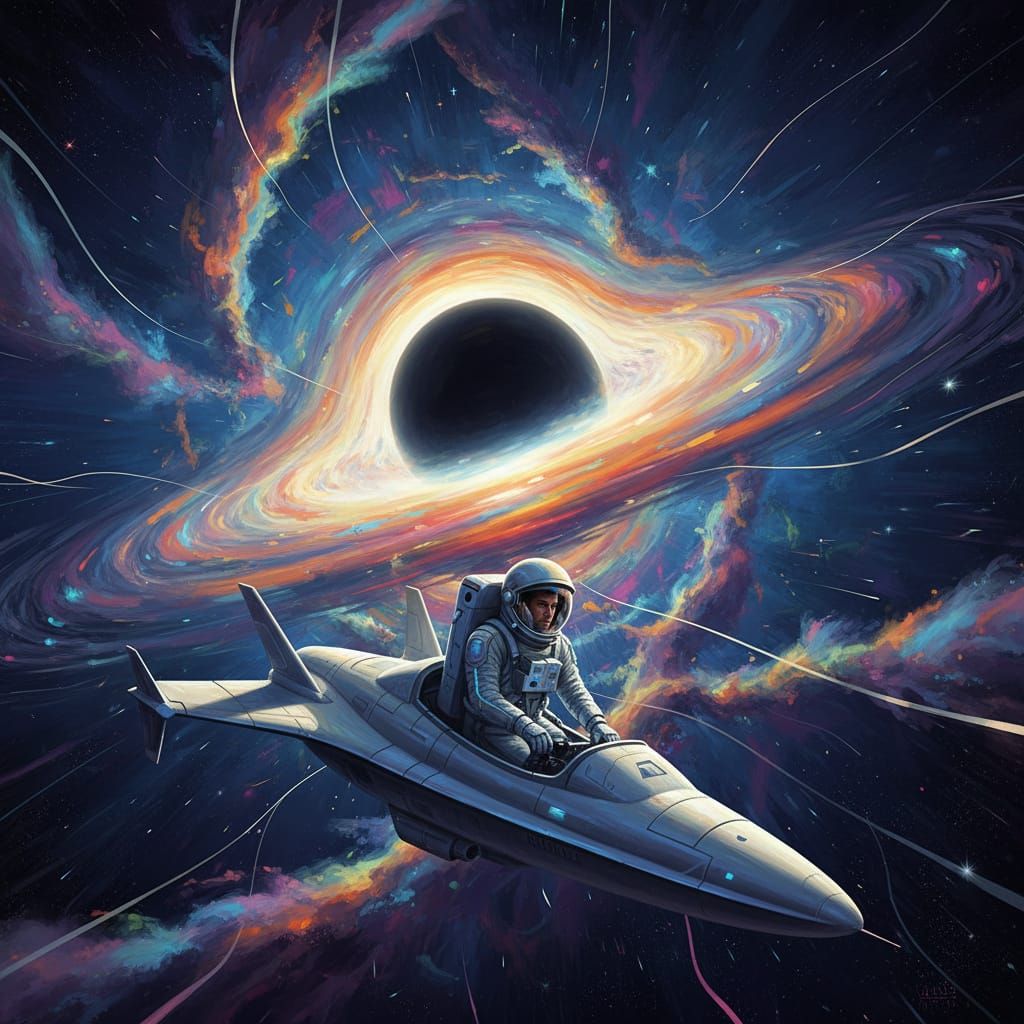 This image shows an astronaut in a spacecraft nearing a swirling, colorful black hole. Cosmic chaos and distorted starlight create a vortex, rendered in a dramatic digital matte painting style.