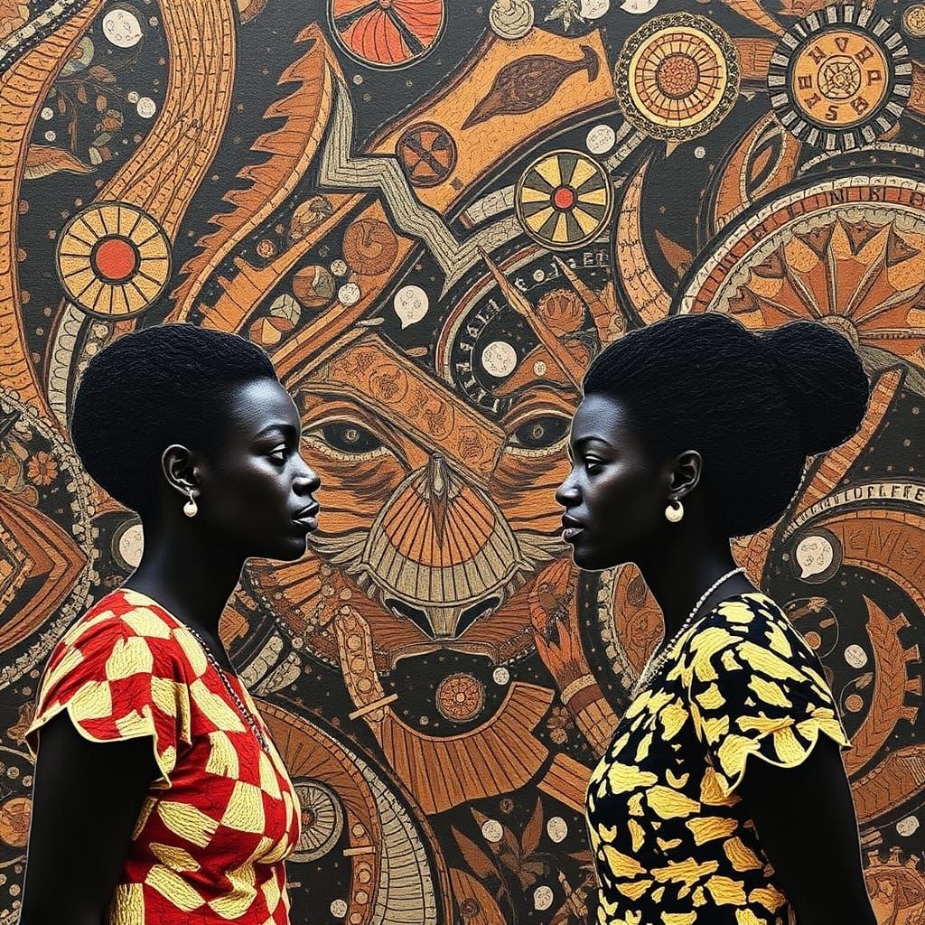A striking image in a mixed media style. This artwork combines elements of collage, painting, and silhouette to explore themes of identity, race, and history. It features bold compositions and contrasting textures.
