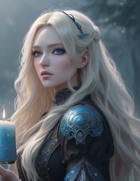 This image shows a beautiful young woman with flowing blonde hair in a dark, enchanted park. She is depicted in a dreamy 3D manga anime style and holds a candle while searching for a glowing fox against a celestial galaxy sky.