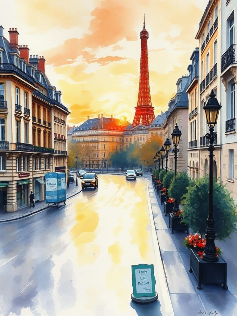 This image shows a beautiful sunrise over a Paris city street, painted in the impressionistic style with rich, muted tones and diffuse lighting, evoking a sense of dreamy, textured beauty.