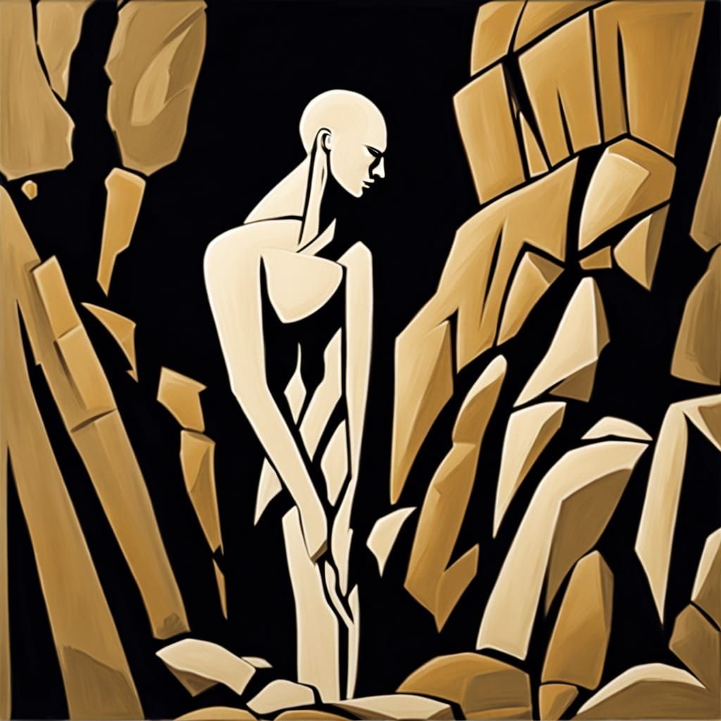 emotive painting/a genderless indistinct central figure stands hemmed in by massive jagged rock walls/the rock walls squeeze together compressing the figure and distorting their body/their head is raised in pain and anguish while their arms stay pinned at their sides/the figure has no facial features ...