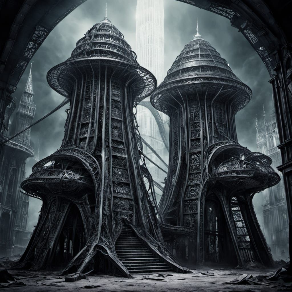 A surreal image of the Eiffel Tower constructed from tangled barbed wire under a dark sky. The artwork features metallic tones and dramatic lighting in a dystopian style.