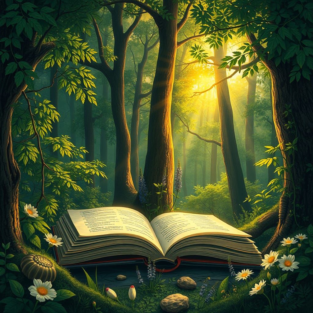 A radiant golden book stands open in a mystical forest. The image features lush foliage, wildflowers, and soft sunlight, reminiscent of classic fantasy art.