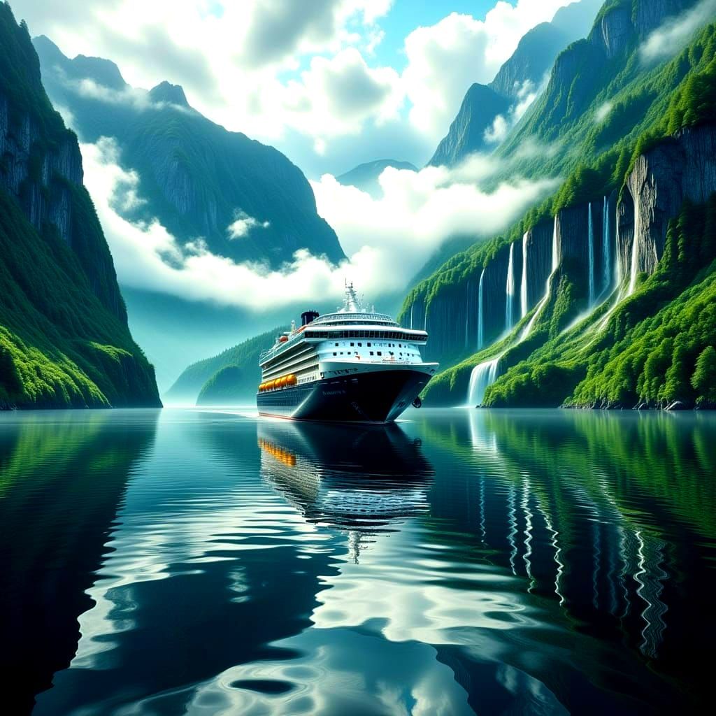A hyperrealistic view of Milford Sound in New Zealand with mist-kissed cliffs and waterfalls. A cruise ship navigates the mirror-dark waters of this beautiful, complex landscape.